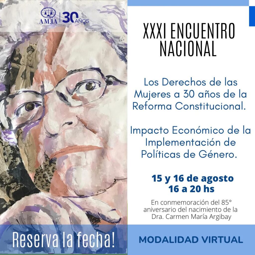 Se informa a los /as socios/as que la Asociación Argentina de Mujeres Jueces (AMJA) ha invitado a participar del XXXI Encuentro Nacional de AMJA “Los derechos de las mujeres a 30 años de la reforma constitucional”, en conmemoración del 85 aniversario del nacimiento de la Dra Carmen  Argibay que se realizará los días 15 y 16 de agosto próximo de 16 a 20 horas, modalidad virtual, el cual fue declarado de interés institucional por nuestra asociación.