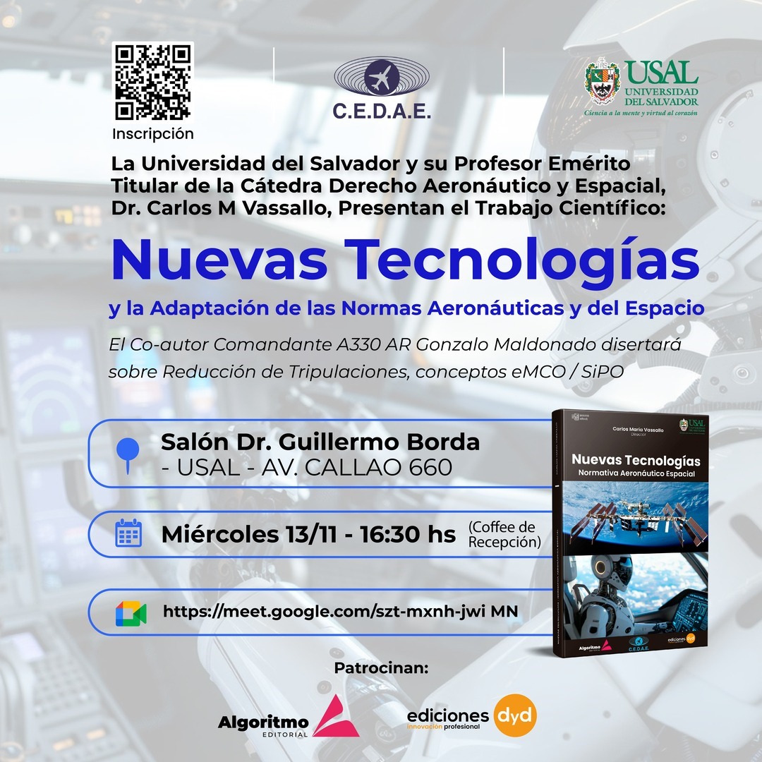 La Asociación de Fiscales y Funcionarios del Ministerio Público Fiscal de la Nación comunica a sus integrantes la invitación recibida a la presentación del Trabajo Científico: Nuevas Tecnologías y la adaptación de las normas aeronáuticas y del espacio que se realizará en el Salón Dr. Guillermo Borda de la Universidad del Salvador el miércoles 13 de noviembre próximo a las 1630 horas. Se adjunta flyer del evento y nómina de autores.